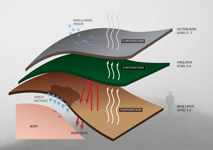 Lớp áo trong cùng là lớp tiếp xúc trực tiếp với bề mặt da, đóng vai trò quyết định trong việc ngăn chặn hiện tượng mất nhiệt do ẩm ướt. Ngay cả khi trời lạnh, cơ thể vẫn liên tục thoát hơi nước; nếu hơi ẩm này bị giữ lại sát da, nó sẽ dẫn nhiệt ra ngoài nhanh gấp nhiều lần so với không khí khô, khiến chúng ta cảm thấy lạnh buốt. Do đó, lớp nền lý tưởng phải được làm từ sợi tổng hợp (polyester, nylon) hoặc len tự nhiên có khả năng "đẩy" mồ hôi ra ngoài. Việc sử dụng áo cotton ở lớp này là một sai lầm phổ biến, vì cotton thấm hút nhưng giữ nước rất lâu, dễ dẫn đến tình trạng nhiễm lạnh ngược cực kỳ nguy hiểm.