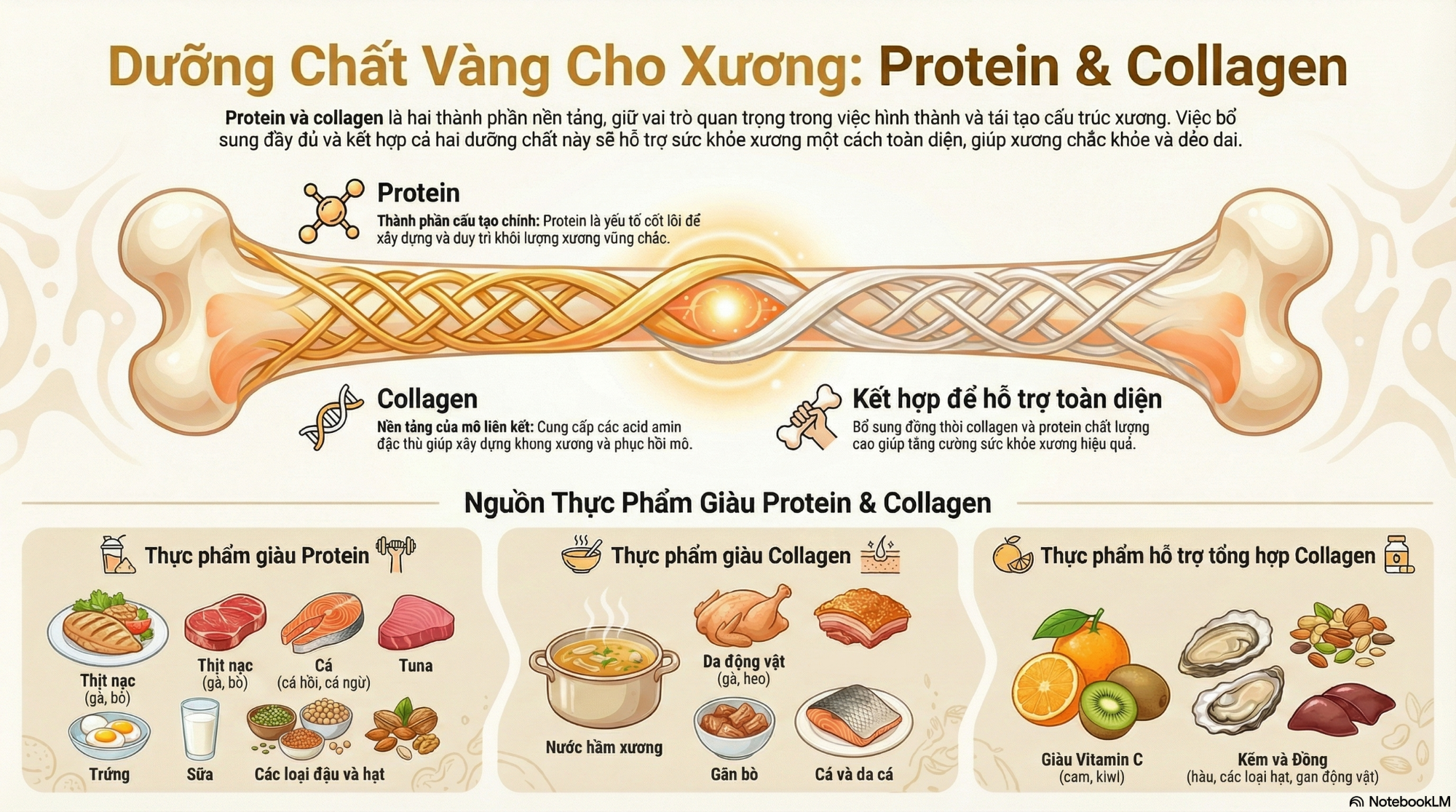 Protein và collagen đều giữ vai trò quan trọng trong quá trình hình thành và tái tạo xương. Protein từ chế độ ăn hỗ trợ tổng hợp protein cơ, nhưng lại không kích thích mạnh quá trình tái tạo mô liên kết của xương. Trong khi đó, collagen thành phần nền của mô liên kết cung cấp các acid amin đặc thù như glycine và proline, giúp xây dựng khung xương và thúc đẩy quá trình phục hồi mô liên kết. Vì vậy, việc bổ sung collagen cùng với protein chất lượng cao sẽ hỗ trợ toàn diện hơn cho sức khỏe xương.