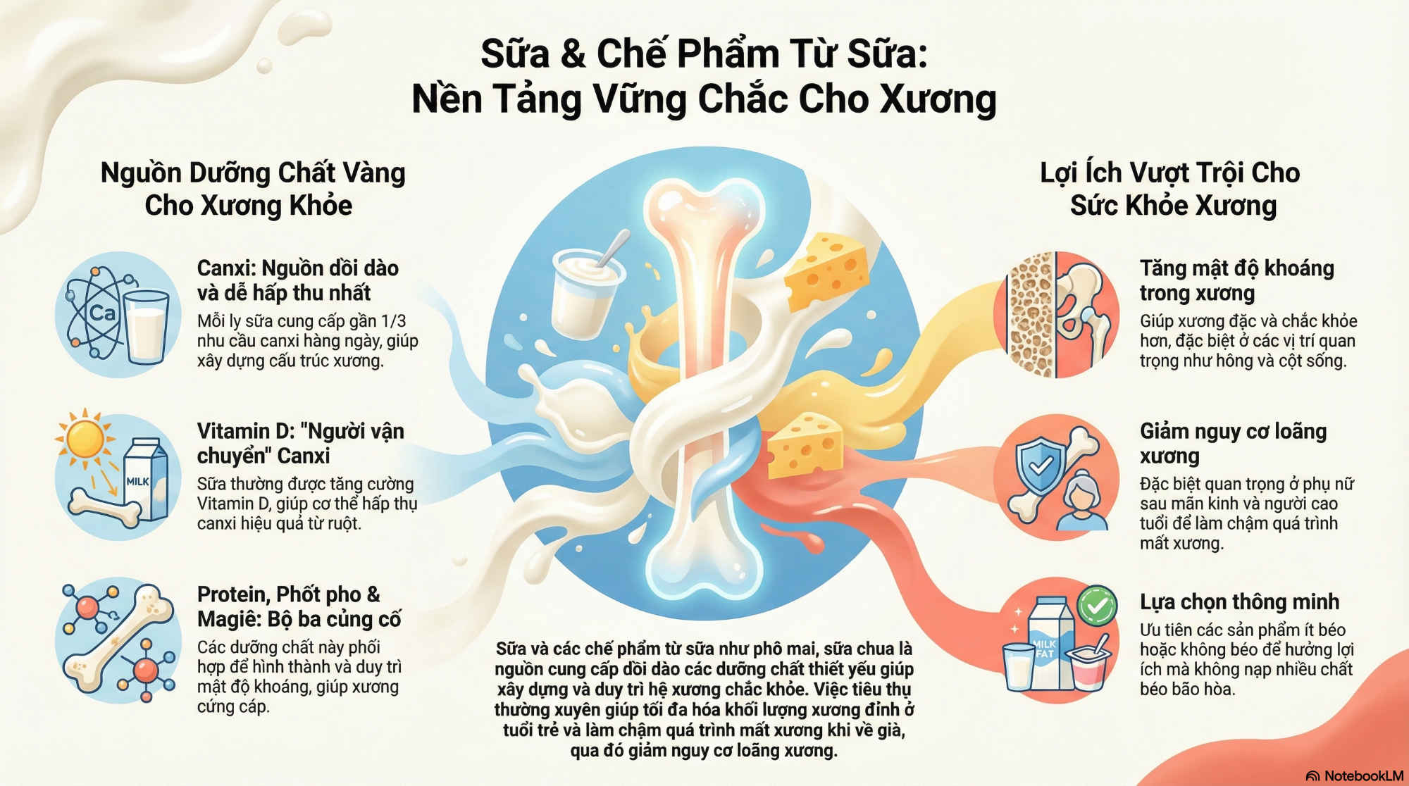 Sữa là nguồn cung cấp canxi và vitamin D dồi dào, hai dưỡng chất thiết yếu giúp xương luôn chắc khỏe và phòng ngừa tình trạng còi xương ở trẻ nhỏ, loãng xương ở người già. Vì vậy lời khuyên sử dụng 3-5 đơn vị sữa và chế phẩm mỗi ngày được áp dụng cho hầu hết các nhóm tuổi.