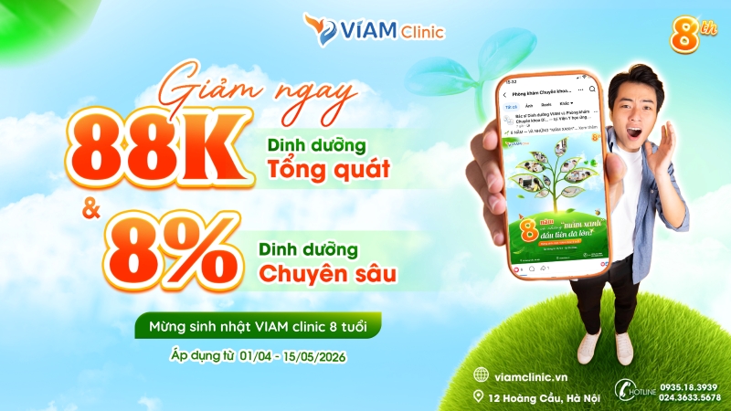 Phòng khám chuyên khoa Dinh dưỡng VIAM (VIAM Clinic) thuộc Viện Y học ứng dụng Việt Nam tư vấn, cung cấp chế độ dinh dưỡng cá thể dành cho những người đang điều trị các bệnh mạn tính, trẻ nhẹ cân, suy dinh dưỡng, trẻ thừa cân béo phì, phụ nữ mang thai và cho con bú,… Hãy liên hệ với VIAM Clinic nếu bạn muốn có chế độ dinh dưỡng hỗ trợ điều trị và cải thiện sức khỏe TẠI ĐÂY hoặc Hotline: 0935.18.3939 / 024.3633.5678