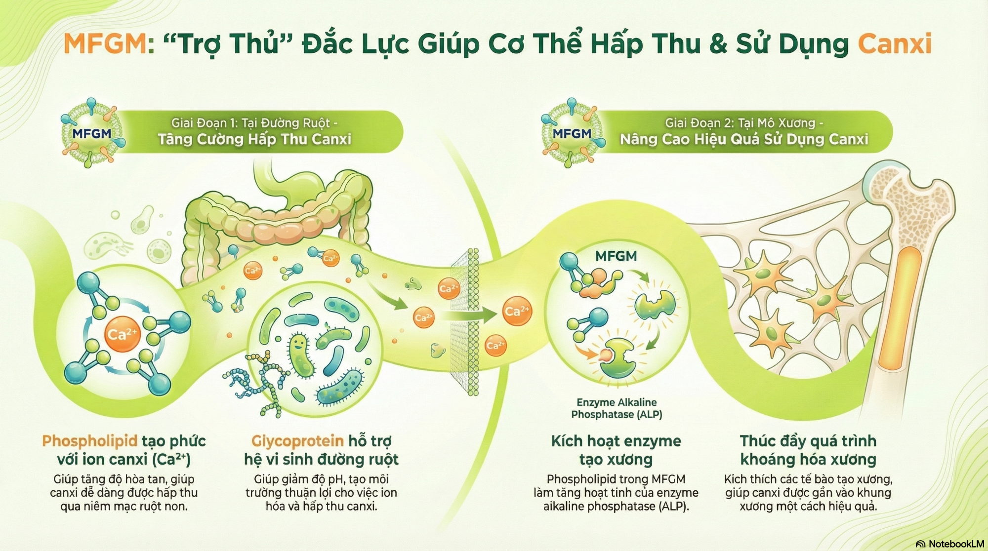 Ngoài tác động trực tiếp lên niêm mạc ruột, các glycoprotein của MFGM như Mucin-1 và Lactadherin còn hỗ trợ duy trì hệ vi sinh đường ruột có lợi, làm giảm pH và tăng ion hóa canxi – điều kiện thuận lợi cho hấp thu khoáng chất.